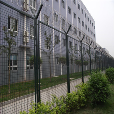 看守所護(hù)欄網(wǎng)又稱作"Y型安全防御護(hù)網(wǎng)”,是由V型支 架立柱,加強(qiáng)型焊接片網(wǎng),安全防盜連接件和熱鍍鋅刀片剌籠組成強(qiáng)度和安全防御性級(jí)別很高。現(xiàn)被廣泛應(yīng)用在監(jiān)獄,軍事基地等高安全場(chǎng)所。