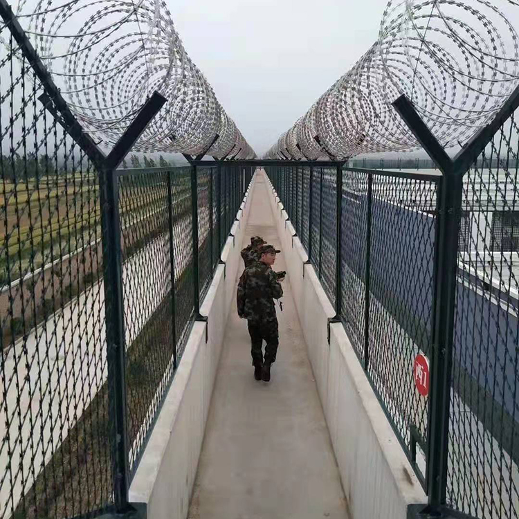 監獄物理隔離網監獄鋼網墻又叫監獄防攀爬隔離網,監獄隔離網,監獄網圍墻是非常重要的監獄安全防護設施,由焊接鋼網加蛇腹形刀刺網組合而成。主要是采用低碳鋼絲焊接或者是編織成的小孔網片,頂部加上防爬的螺旋滾刺網,由V型支架立拄,加強型焊接片網,安全防盜連接件和刀片刺網組成,既安全環保又經久耐用。監獄防攀爬隔離網,監獄隔離網,監獄網圍墻立柱焊接成Y型,表面浸塑處理,網片高度2000m-3000mm,長度2500m-3000mm,v型頂端安裝刀片刺網,直徑采用50cm-60cm,刀片剌網主要是由熱鍍鋅鋼板或不銹鋼薄板沖壓而成的,它擁有尖銳的刀片,高張力鍍鋅鋼絲或者不銹鋼絲做芯線組合而成的產品。監獄護欄網網格結構簡練、便于運輸、安裝不受地形起伏限制,特別是對于山地、坡地、多彎地帶適應性極強。監獄編織隔離網,看守所編織隔離網,在押犯編織隔離網材質:低碳鋼絲中碳鋼絲不銹鋼絲等