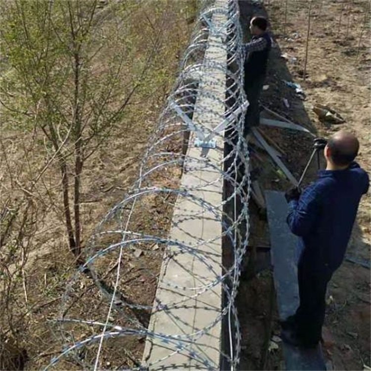 當(dāng)然為了防止小偷沒被嚇到先把自己嚇到的情況,在進(jìn)行刀刺隔離網(wǎng)安裝時,支架每兩個之間間距3米,這樣不僅起到了防腐效果,還很美觀,不會讓里面居住的人感到不適。再者安裝好立柱后,先把要安裝刀刺隔離網(wǎng)的根立柱上拉上鐵絲,然后用鐵絲將刀片刺網(wǎng)串聯(lián)在一起,然后再把鐵絲固定在安裝好的立柱上。最后也是最簡單的一步,把用鐵絲串接在一起的刀片刺網(wǎng),拉開固定就行了。這樣一個擁有防腐效果且美觀的防護(hù)設(shè)施就完成了。
