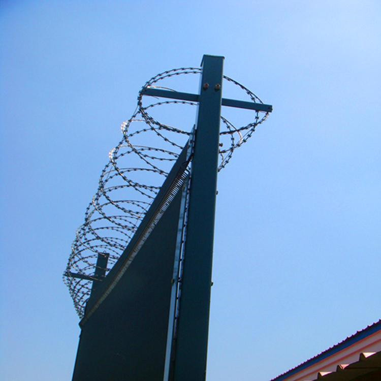 監(jiān)獄鋼網(wǎng)墻采用高強(qiáng)度的刀片刺網(wǎng)與普通防護(hù)網(wǎng)的結(jié)合,由V型支架立拄,加強(qiáng)型焊接片網(wǎng),安全防盜連接件和組成。監(jiān)獄護(hù)欄網(wǎng)網(wǎng)格結(jié)構(gòu)簡練、便于運(yùn)輸、安裝不受地形起伏限制,特別是對于山地、坡地、多彎地帶適應(yīng)性極強(qiáng)。螺旋型交叉刀片刺網(wǎng)是在兩條刀片刺網(wǎng)之間以不銹鋼片和鍍鋅鋼片強(qiáng)力夾扣,展開后即呈交叉狀,美觀又實(shí)用。