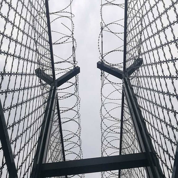 監獄、看守所巡邏道隔離網上部安裝刀片剌網(刺絲滾籠) ,刀片刺網具有嚇阻、防翻越等效果材質堅硬,高強度高張力,造型設計獨特,不宜觸摸因而能達到極好的防護隔離效果。巡邏道隔離網還具有施工簡便經濟實用等優點。