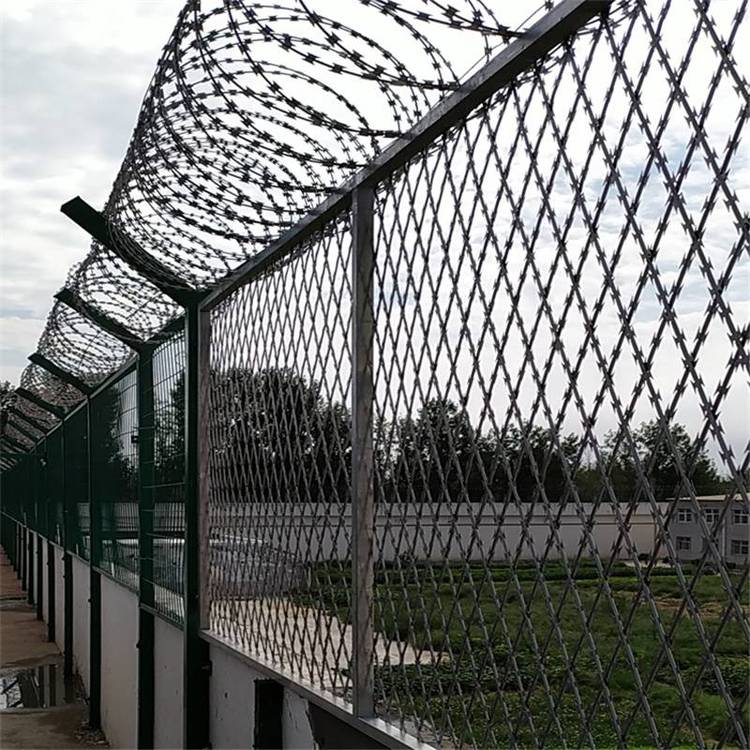 監獄高墻隔離網也叫巡邏道隔離網,是監獄非常重要的安全防護設施,由鋼筋焊接成網加蛇腹型刀片刺網組合而成,監獄高墻隔離網具有結構新穎、堅固緊密、網面平整、網孔均勻、刀鋒銳利、防攀爬、坑腐蝕等特點。監獄高墻隔離網是建在監獄的內外墻上,網墻內側或者頂部加裝蛇腹型刀刺網,形成一道高不可攀、難以逾越的隔離網屏障,配合高壓打擊電網和監控報警設備等保障監獄安全萬無一失。