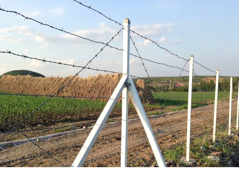 5、T字型邊境鐵絲網(wǎng),"T型網(wǎng)樁刺鐵絲按側(cè)部14道橫絲,2道斜拉絲,頂部5道橫絲的標(biāo)準(zhǔn)架設(shè),側(cè)培刺鐵絲間距15厘米,底部刺鐵絲距離地面距離為5厘米,頂部刺鐵絲間距為20厘米,相鄰兩個立樁之間斜拉刺鐵絲與水平刺鐵絲交叉處用專用卡扣固定,方型鋼樁刺鐵絲側(cè)部按14道橫絲, 2道斜拉絲,頂部3道橫絲的標(biāo)準(zhǔn)架設(shè),側(cè)培刺鐵絲間距為15厘米,底部刺鐵絲距離地面距離為5厘米,頂部刺鐵絲間距為12.4厘米,相鄰兩個立樁之間斜拉刺鐵絲與水平刺鐵絲交叉處用專用卡扣固定。