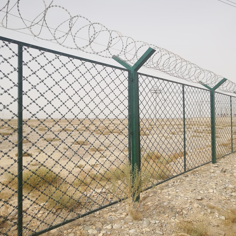 1、隔離防護(hù)網(wǎng):采用刀片刺繩菱形網(wǎng)格形式,低碳鋼絲材質(zhì),